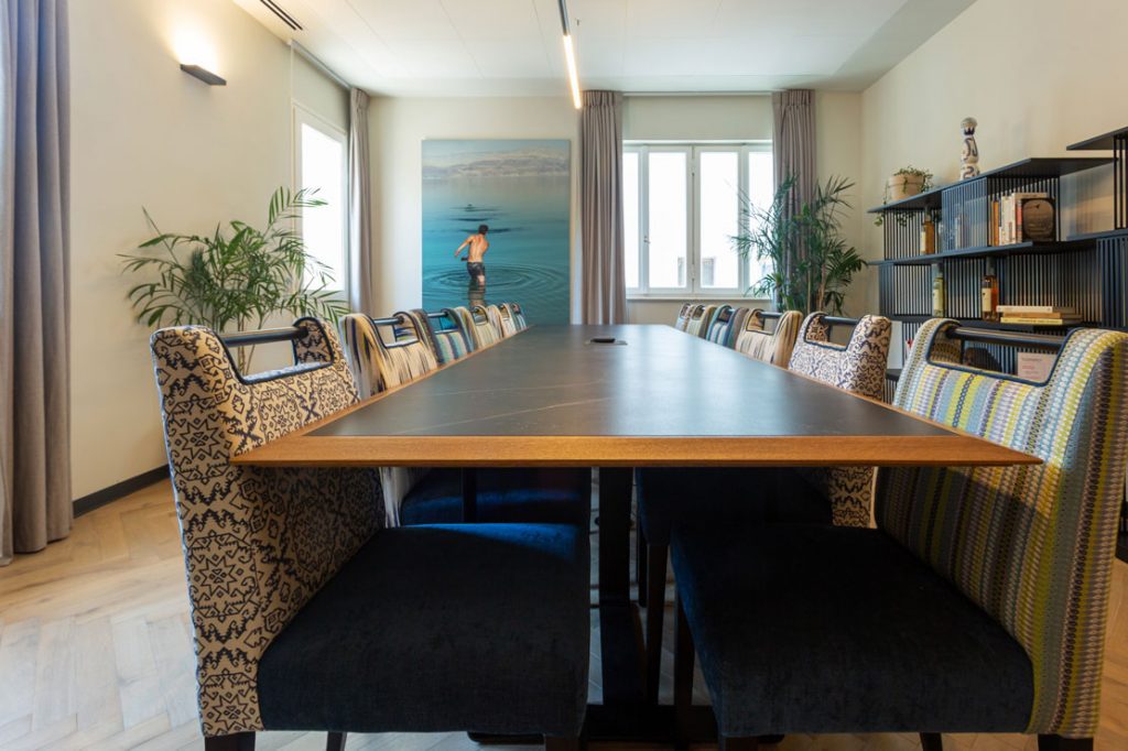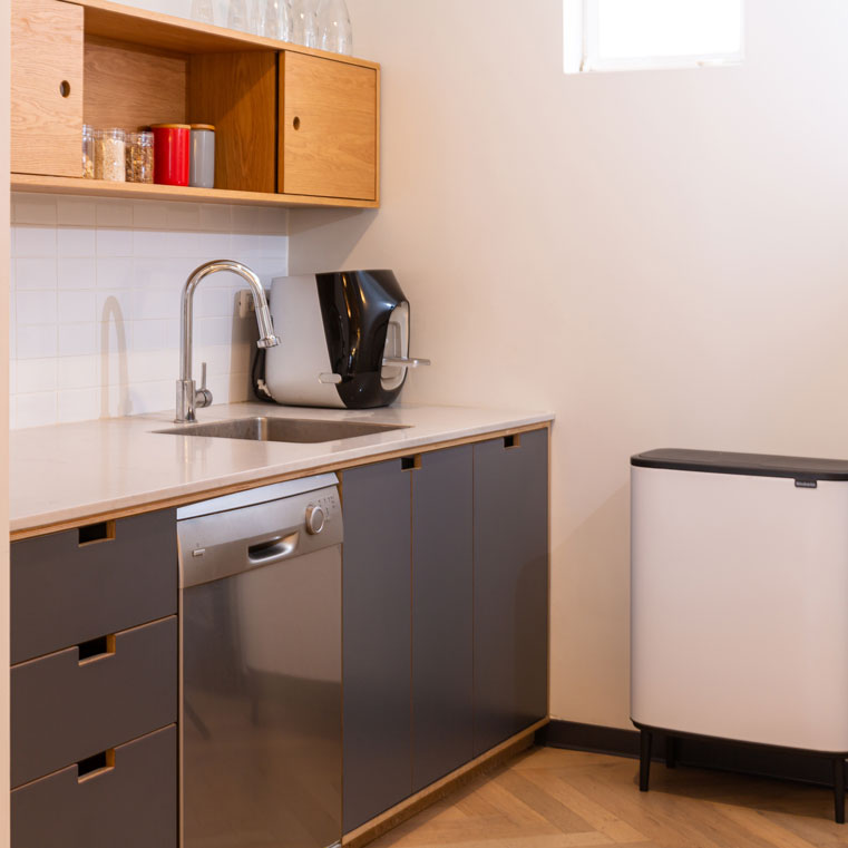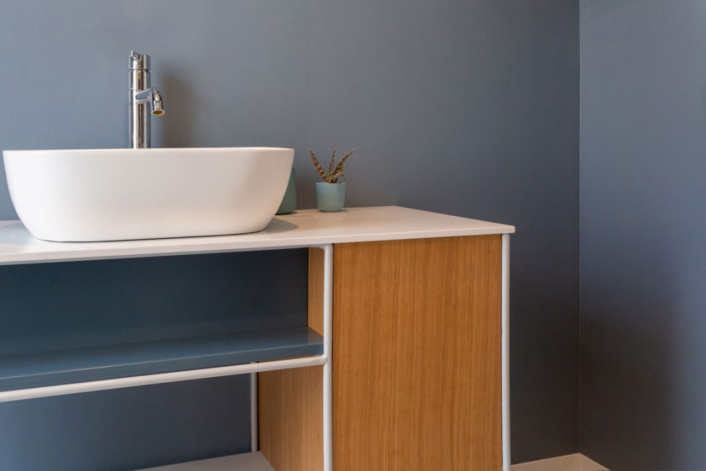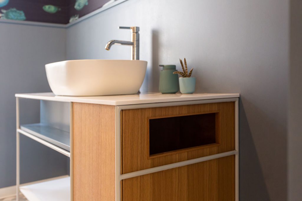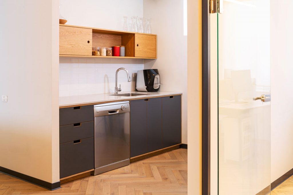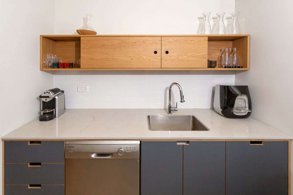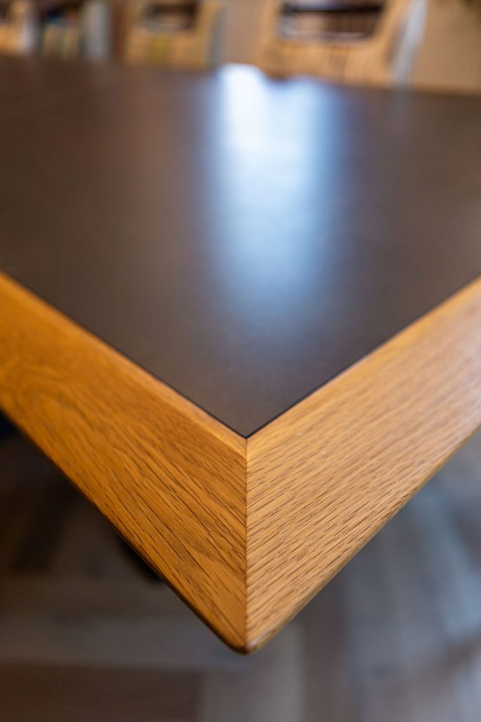 שולחן ישיבות – ממש מיוחד בנוי מעץ אלון מפירוק של חביות יין עם ליבת משטח גרניט פורצלן.ארונות כיור- שילוב של עץ, ברזל ומשטחי קוריאןמטבח- בירץ’ עם פורמייקה , ידיות אינטגרליות ועץ אלון.